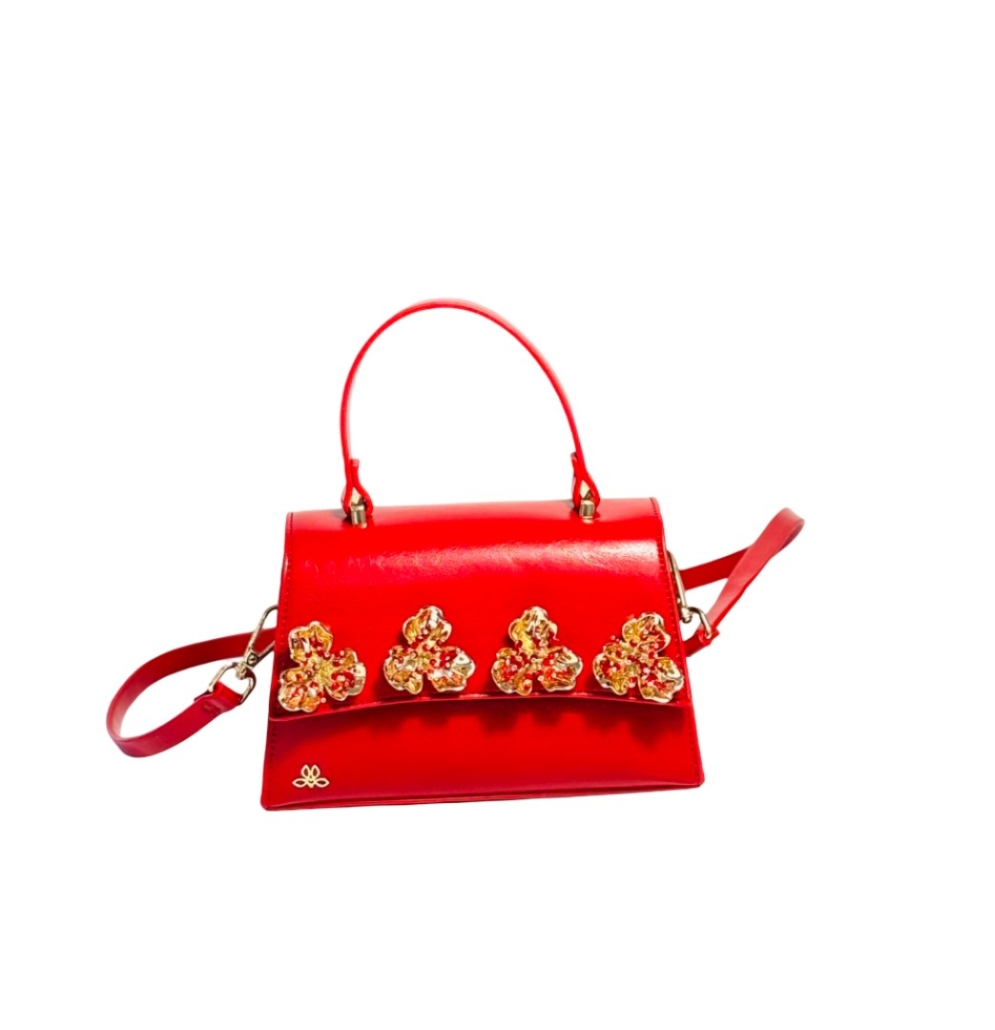 Accessori: fiore a conchiglia oro con campanellini oro e perline rosse