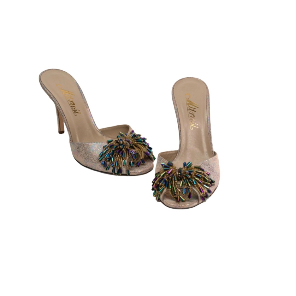 Accessories: Hand-decorated bow with golden beads and multicolored bells