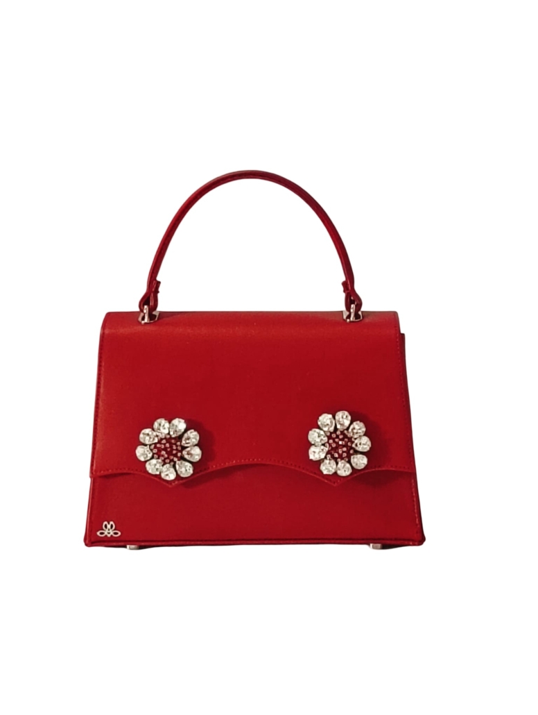 Materiale: Capretto rosso Accessori: Fiore fatto e cucito a mano con goccia crystal e perline rosse Manico: cm 27 Misure: L 24 cm x H 24 cm x P 9 cm Logo: M argento