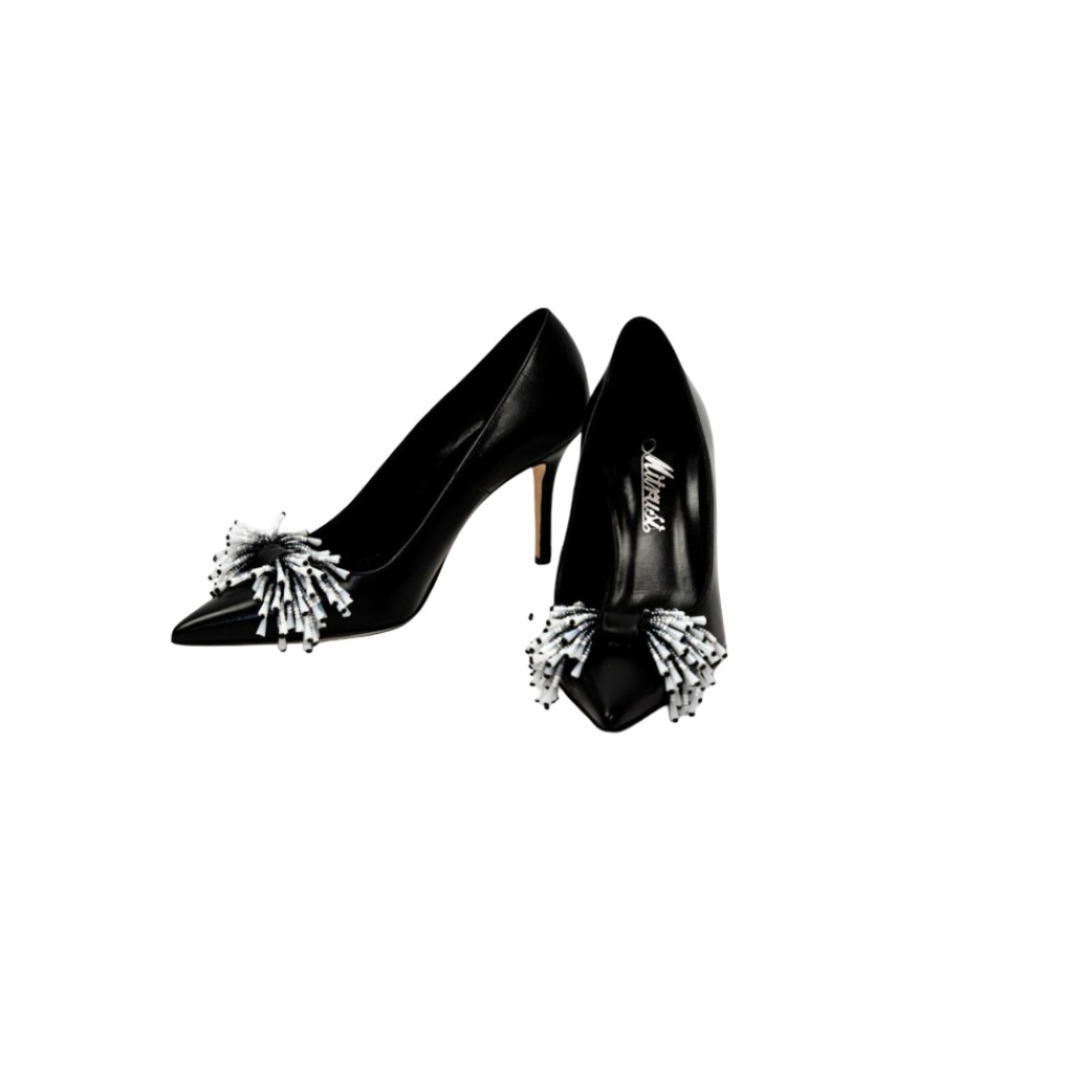 Accessori: fiocco decorato a mano con perline nelle tonalità di nero, grigio e bianco.