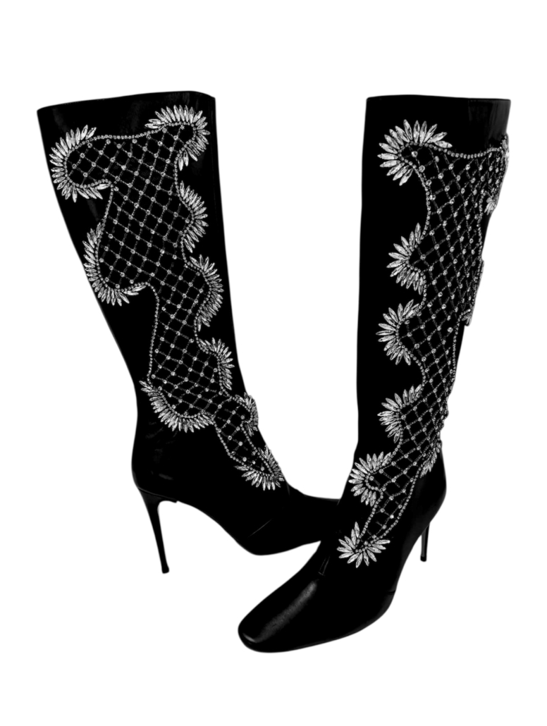 Stivale ART 11 in capretto nero + rete con perline e catena argento.