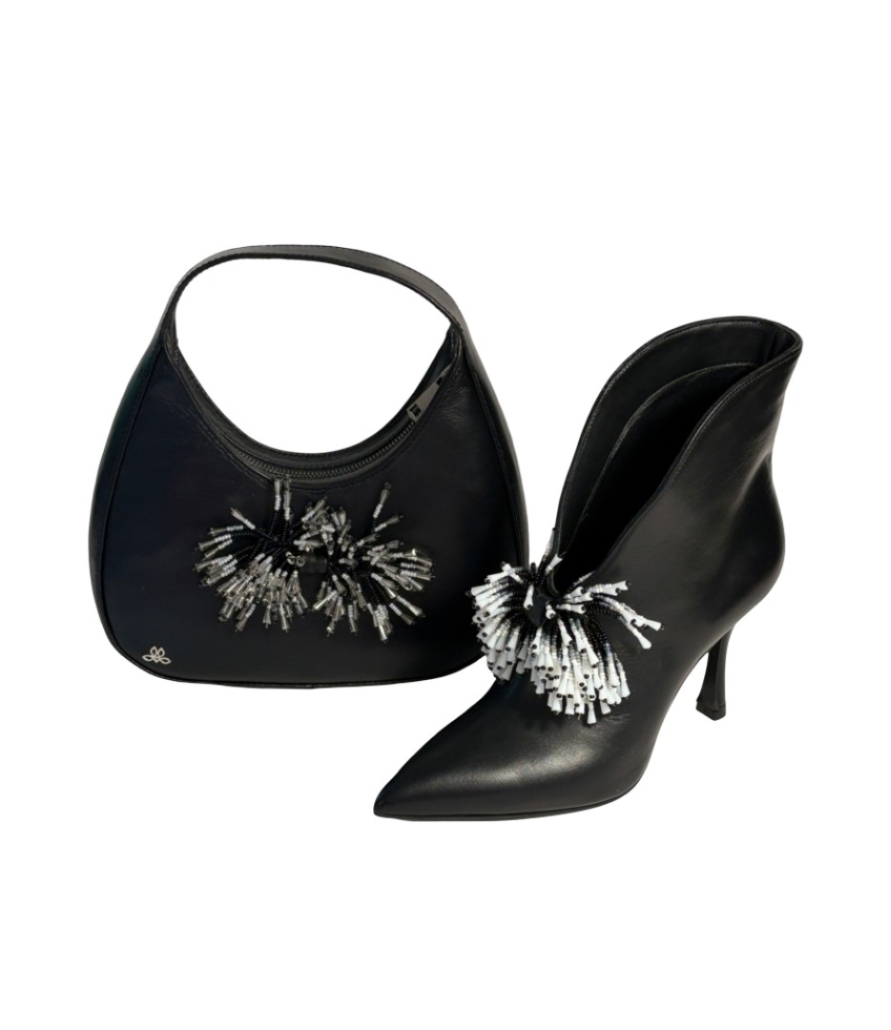 Stivale NOUR in vitello nero + fiocco con perline nere, grigie e bianche
